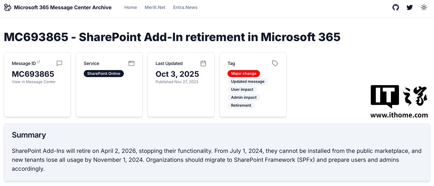 如今,微软在 Microsoft 365 贬责中心音问(MC693865:“SharePoint Add-In retirement in Microsoft 365”)中精良证据,将在 2026 年 4 月 2 日透吩咐手对 SharePoint 外接次第的支援。届时,这些外接次第将十足无法运转。