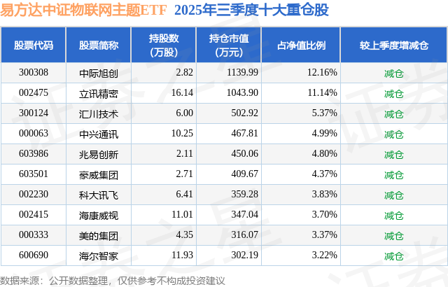 从基金范畴来看,易方达中证物联网主题ETF基金2025年三季度公布的基金范畴为0.94亿元,较上一期范畴6717.62万元变化了2656.26万元,环比变化了39.54%。该基金最新一期钞票建立为:股票占净值比99.04%,无债券类钞票,现款占净值比1.09%。从基金抓仓来看,该基金当季前十大股票仓位达56.95%,第一大重仓股为中际旭创(300308),抓仓占比为12.16%。